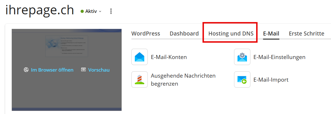 6. Gehen sie zurück zur Hosting Übersicht und wählen das Register "Hosting und DNS" aus.